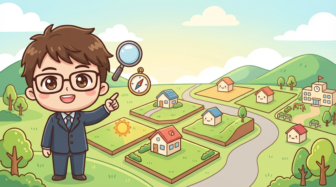 注文住宅の土地探しのコツを10項目で徹底解説。ハザードマップ・用途地域・地盤・日当たりなどのチェックポイント、土地探しの流れ10ステップ、よくある失敗例と対策、購入にかかる諸費用まで網羅。失敗しない土地の探し方がわかります。